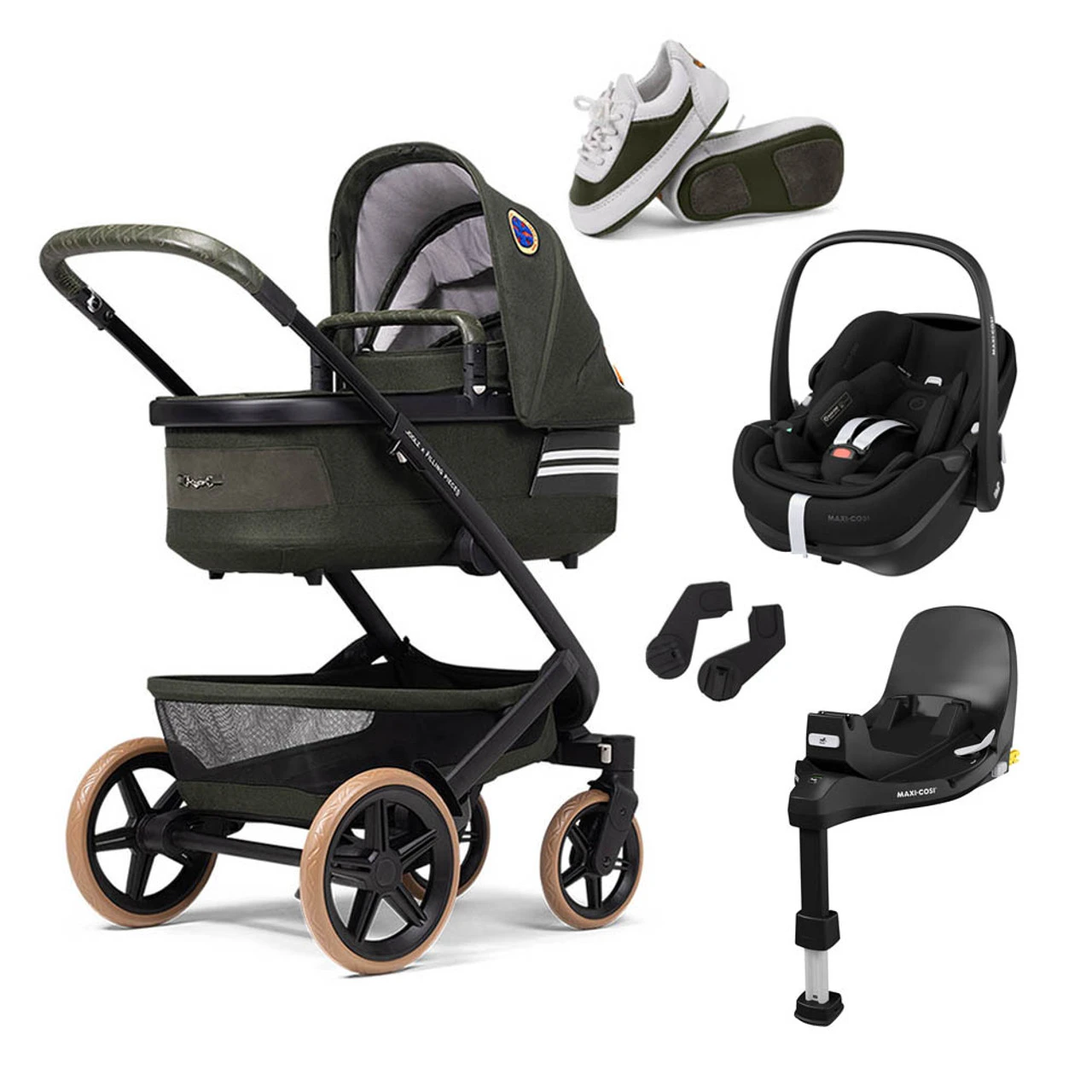 This special edition package includes chassis with front and rear wheels, seat unit, carrycot, shopping basket, bumper bar, Maxi Cosi Pebble 360 Pro Car Seat, Familyfix 360 Pro Base, car seat adaptors, raincover, matching pair of baby sneakers and manual.